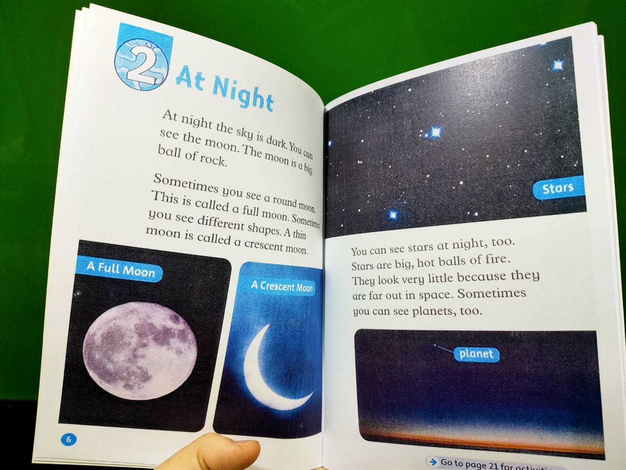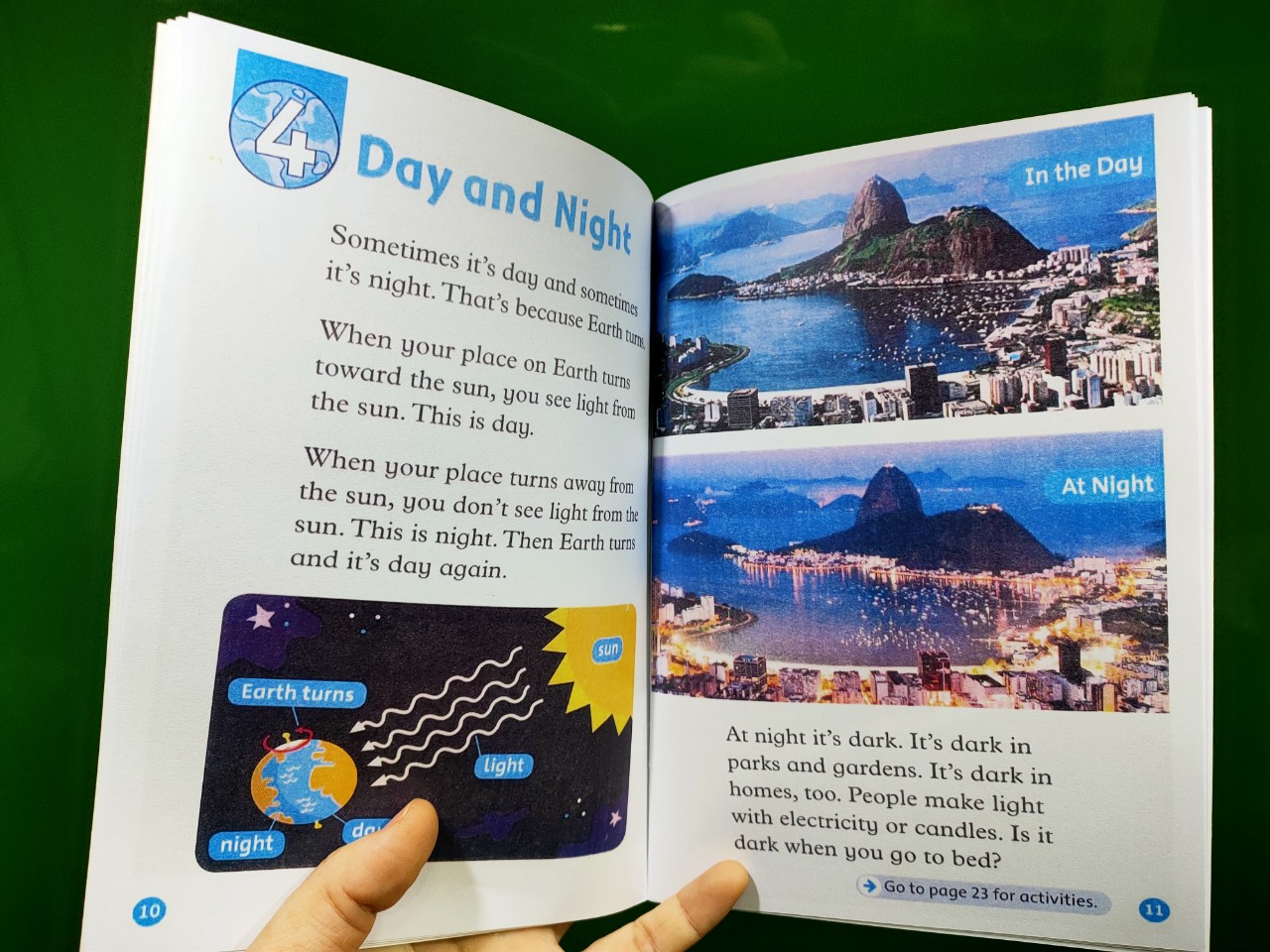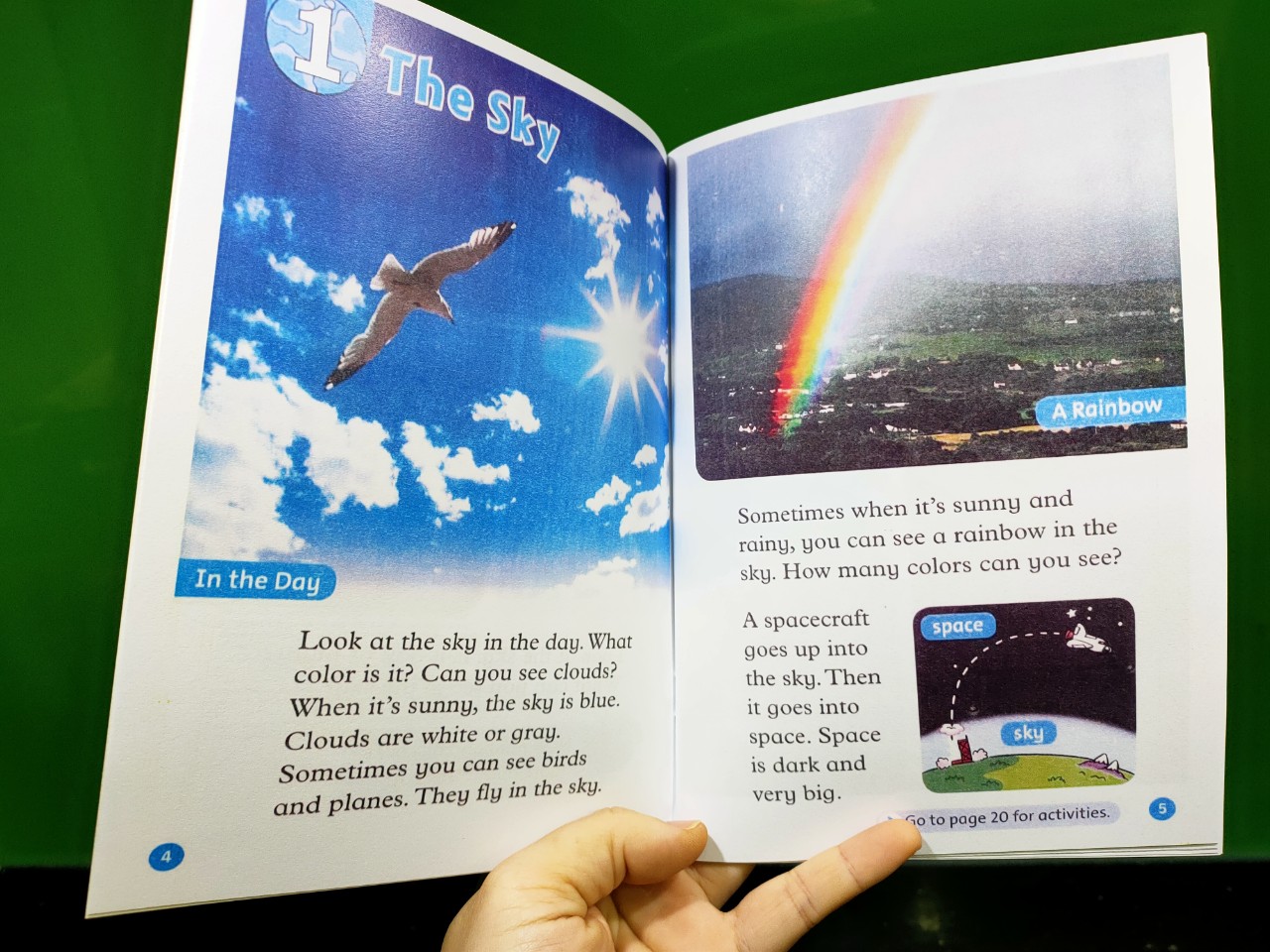 - Phần nội dung chính: đi sâu khai thác chủ đề mà cuốn sách đó nói đến 1 cách chi tiết, cụ thể, tỷ mỉ giúp người đọc hình dung ra tốt hơn: Ví dụ về về chủ đề “In the sky” thì sẽ tập trung khai thác ban ngày bầu trời như thế nào, buổi tối thì thế nào kèm theo hình ảnh về thế giới tự nhiên vô cùng chân thực mà bé sẽ ngỡ như là đang xem trên kênh Discovery luôn đó ạ.